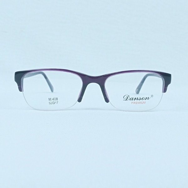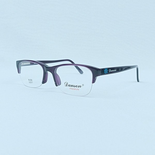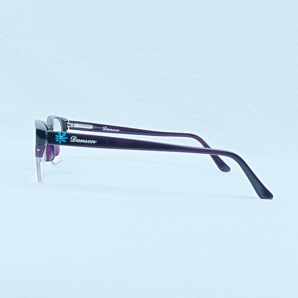 Elegant and lightweight, this Danson M.408 ladies half-rim eyeglass features a stylish purple upper frame matched with a sleek black–purple gradient temple design. The floral temple logo adds a soft feminine touch, making it ideal for students, professionals, and daily eyewear users.
