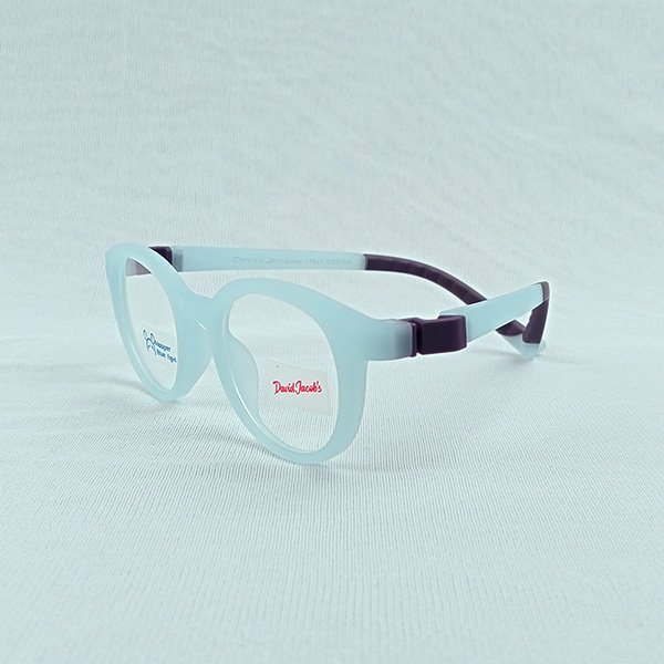David Jacobs XW007 is a cute and comfortable kids eyeglass frame specially designed for young children. The frosted light blue front paired with dark purple temples gives a soft, playful look. Crafted from flexible TR90 material, this frame is lightweight, durable, and safe for everyday kids’ activities.