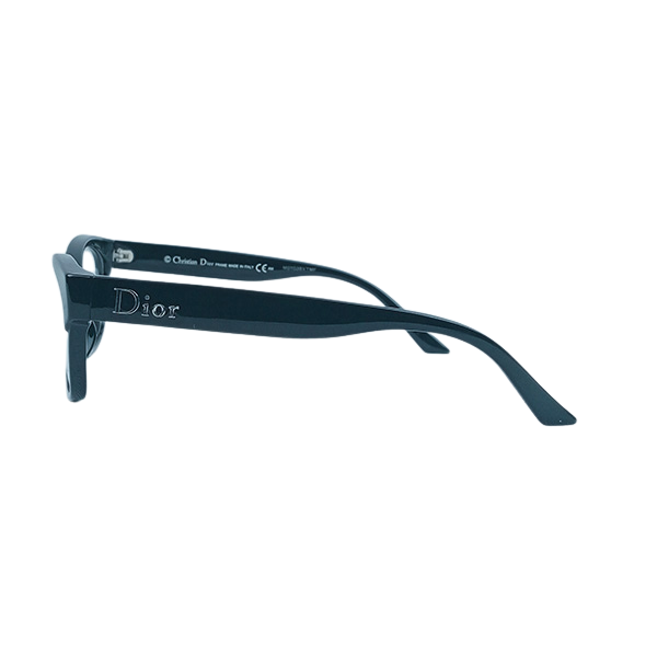 A premium designer eyewear from Dior featuring a sleek glossy black frame with a soft cat-eye inspired silhouette. The bold temples carry the iconic Dior logo, adding luxury and elegance. Perfect for modern women looking for a classy, lightweight, and fashionable daily-wear frame.