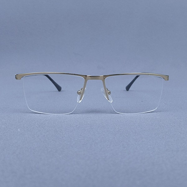 A premium lightweight half-rim metal frame crafted with a refined gold finish and a modern rectangular front. Its sleek temple design and premium construction make it a stylish choice for office professionals and everyday users. Comfortable fit with adjustable nose pads ensures all-day wearability.