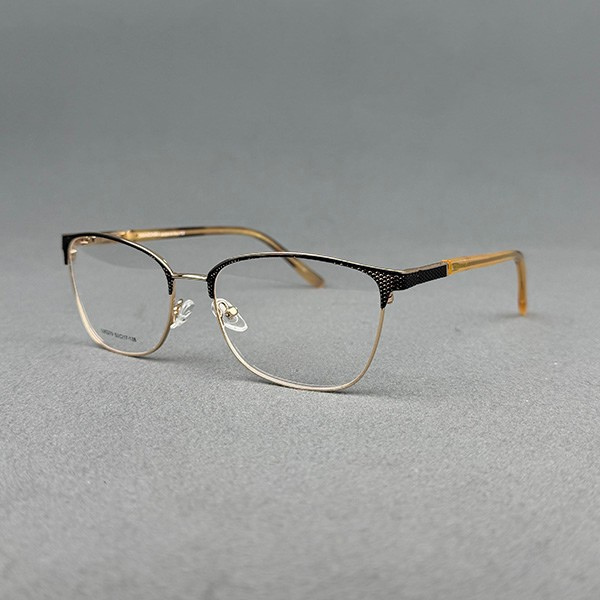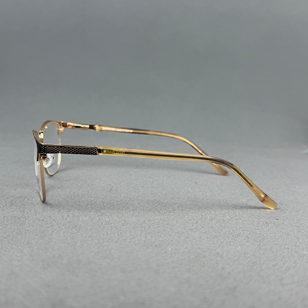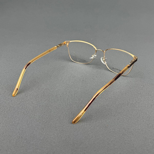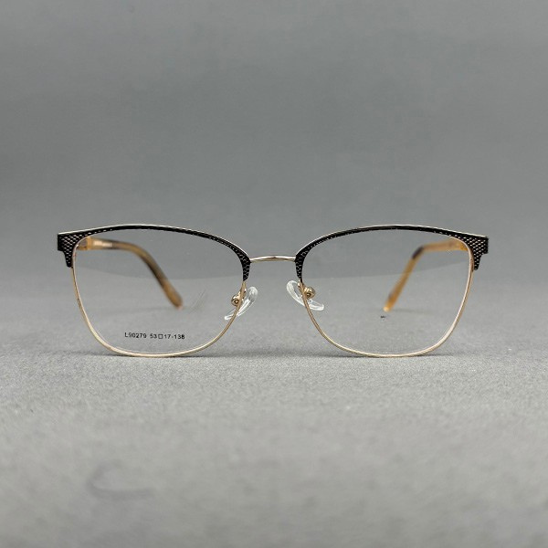 Model L90291 is an elegant ladies full-frame eyeglass crafted from premium-quality metal with a luxurious gold finish and subtle black detailing on the upper rim. The refined rectangular shape offers a classy and feminine appearance, making it perfect for office wear and everyday use.