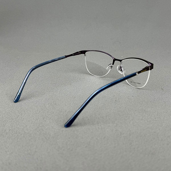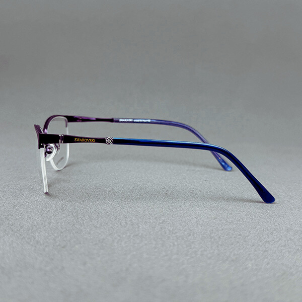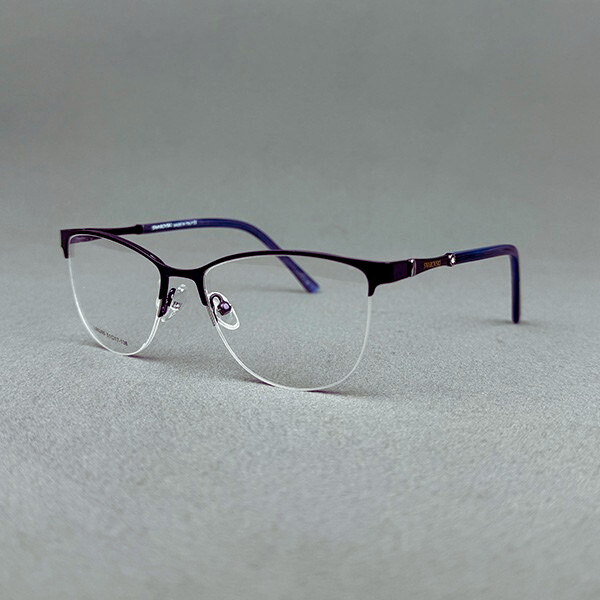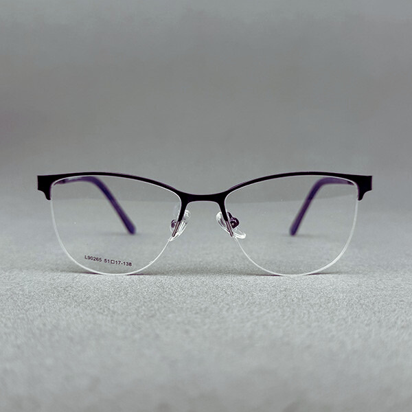 Model L90265 is a stylish ladies half-frame eyeglass crafted from lightweight metal with an elegant purple finish. The clean rectangular silhouette offers a modern, feminine look—perfect for office wear and daily use.